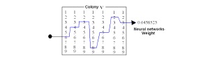 Figure 9. A solution path is a vector coded as seven significant decimal digits searching by ants to adjus Neural networks weights (W or V) for colony v.