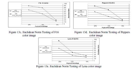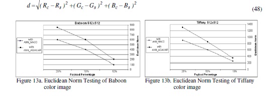 The results show that distances of four images are calculated individually; it seems that the smallest norm is reached when the proposed algorithm using ANN_MACO is implemented. Moreover, we observed that the greatest difference is at the image Baboon with pay- load percentage equal 37% when the earliest work (El-Emam, 2013) [17] is used, while with the proposed algorithm with/without using ANN_MACO, we can reduce the difference by approximately 24%.