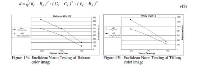 Two kinds of testing are implemented, the first one bases on the set of the closest colors (one corresponding to the same pixel) using Euclidean norm Eq. (48) to find the distance between the cover-image and stego-image. Experimental testing of the Euclidean norm has been implemented on two algorithms (ANN_AGAUAR algorithm [17] and the proposed algorithm ANN_MACO), see Figs. 13a-13e.