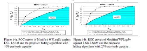 The performance of the proposed steganography algorithm to hide secret message in the color image at the spatial-domain has been evaluated and tested against statistical attacks using modified WFLogSv attacker [21]. The experimental results have been implemented on 500 color images to check imperceptible level and compared with two hiding algorithms, standard LSB and modified LSB, (see [21]). We apply “Receiver Operating Characteristic” (ROC) curve, see Figs. 14(a-b), which are based on two parameters, the probability of false alarms ( FA P ) and the probability of detections (1 – PMD ), see Eq.(49).