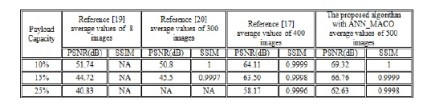 It seems that the proposed algorithm is working efficiently, and the proposed ANN_MACO has outperformed algorithms in [17,19, and 20]. The Table 3 shows that PSNR for 10% payload increased significantly from 51.74 in [19], 50.8 and 64.11 in [19] and [20] up to 69.32 dB using the proposed ANN_MACO, where the greatest improvement of 22.04 dB with ANN_MACO when performed with payload capacity of 15%. On the other hand, Table 3 shows a similarity SSIM using ANN_MACO relatively better than the algorithms referenced in [17, 19, and 20].